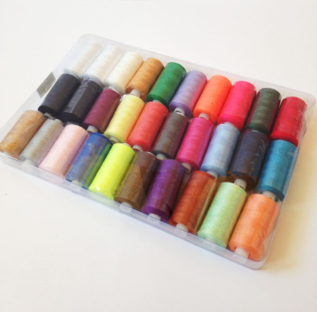 A box of 30 assorted colours from our Vangard Spun Polyester range. These 500 yard cops are produced using high tenacity polyester fiber and are suitable for machine and hand sewing.